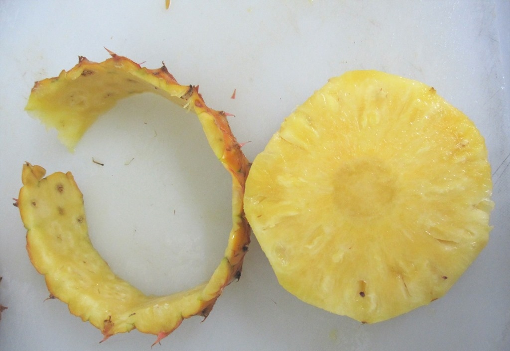 切鳳梨時,一定要把果肉外層,那些黑黑的部分切掉,不然吃的時候,容易"咬舌頭",