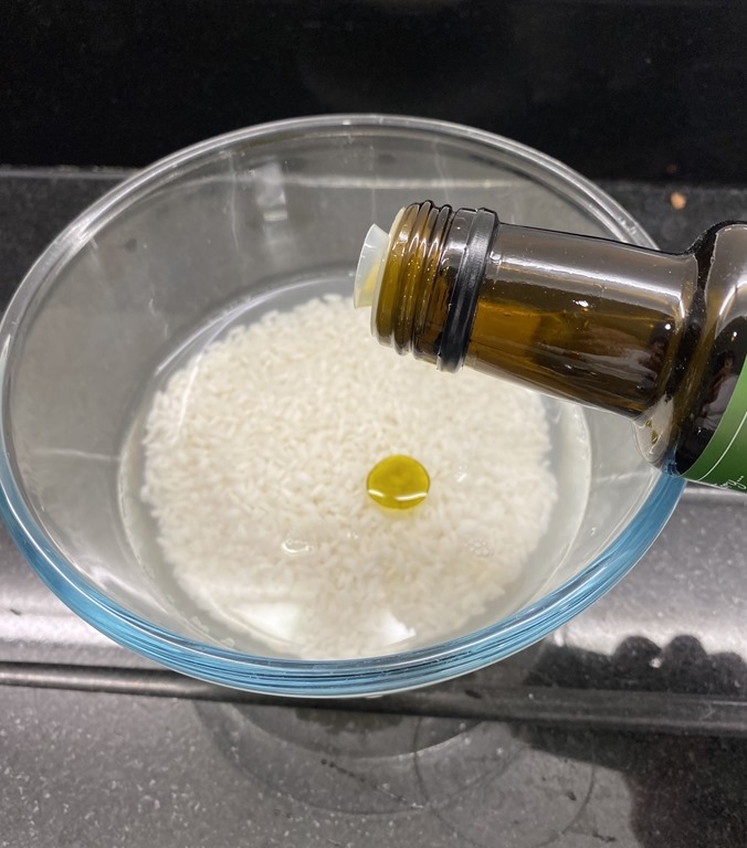 先在微波爐內放著,燜個至少三分鐘,讓米粒吸水。